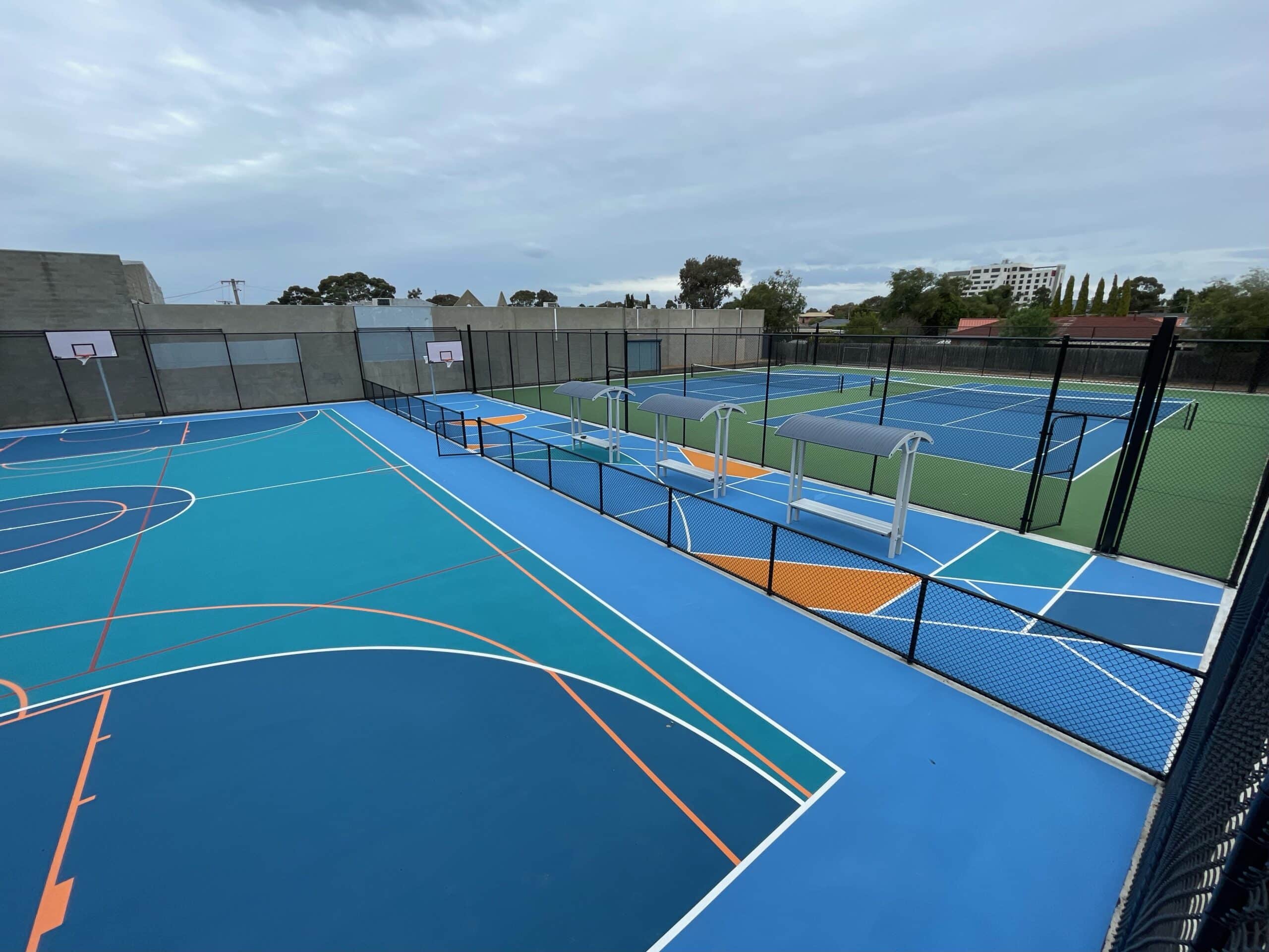 Client: Hume City Council Value: $560,000 The project involved the complete overhaul of exisiting outdoor tennis courts at Derby Street Reserve in Tullamarine. The new facilities included two tennis courts, and a share basketball/futsal court with striking 'art court' surfacing. Field Form were contracted to complete all the associated works including demolition, earthworks, pavement construction, drainage infrastructure and asphalting, along with fencing, acrylic surfacing and court side amenities.